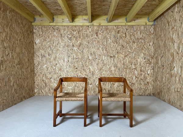 Paire de fauteuils en pin et paille